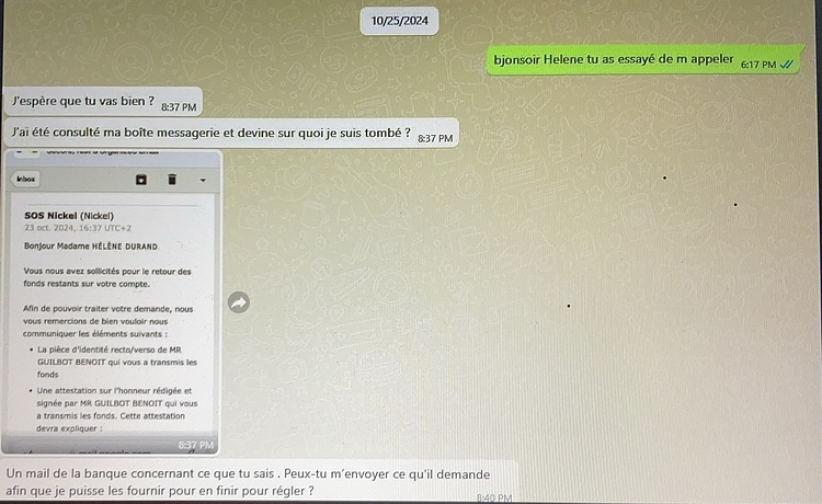 Le 25 octobre 2024 elle m a fait parvenir soi disant un mail de la banque nickel qui lui demandait de communiquer ma carte d identité pour solder les 2000 euros initialement versés sur le compte nickel, compte prétendument bloqué.