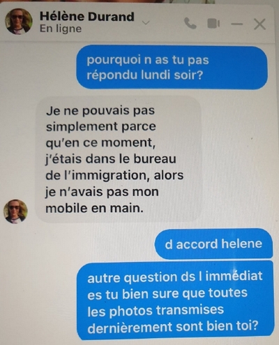 J'arrive à l'aéroport après 1e lundi soir a 22h25. Ne la voyant pas descendre je l appelle plusieurs fois téléphoniquement et lui envoie plusieurs sms sans réponse.Helene Durand ne descendra pas de l avion. Je repars et 100 kms sachant que je recommence a travailler a 6h30 le lendemain. Les sms et sur factures en provenance de l étranger pour cela elle s est mise a me parler sur Facebook. J ai créé un profil spécialement pour ça.Dans la nuit de lundi a mardi je reçois un message de sa part comme quoi elle est toujours au Maroc qu'elle a du faire un test du a une possible contamination par pèlerins de la Mecque de plus son titre de séjour était expiré depuis 2 jours et qu elle était au service de l immigration en attendant l intervention de l avocat le lendemain. J ai eu des mots durs envers elle par sms. Elle a essayé de m appeler encore cet après midi et m a fait parvenir sa carte de résidence. J e n ai pas répondu a ses appels je voudrais être sur