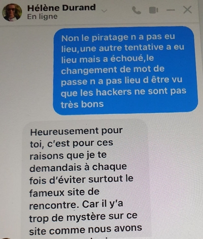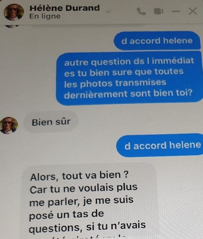 J'ai rencontré Helene Durand sur le site jecontacte.com fin avril 2024. Nous avons échangé par sms et whatsapp essentiellement.
