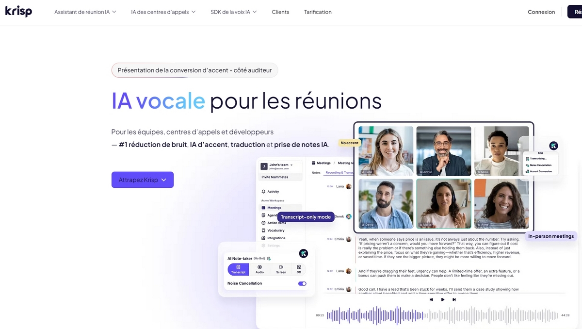 Krisp (Accent Localization) : Un outil qui commence à intégrer des fonctions permettant de transformer un accent étranger en accent local (par exemple, accent américain ou français standard) durant des appels.