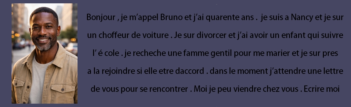 "Bonjour, je m'appelle Bruno et j'ai quarante ans. Je suis à Nancy et je suis chauffeur de voiture. Je suis divorcé et j'ai un enfant qui va à l'école. Je recherche une femme gentille pour me marier et je suis prêt à la rejoindre si elle est d'accord. En ce moment, j'attends une lettre de vous pour nous rencontrer. Moi, je peux venir chez vous. Écrivez-moi."